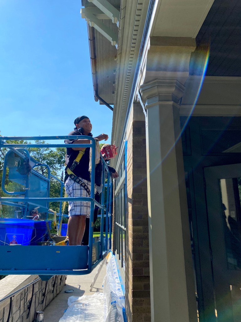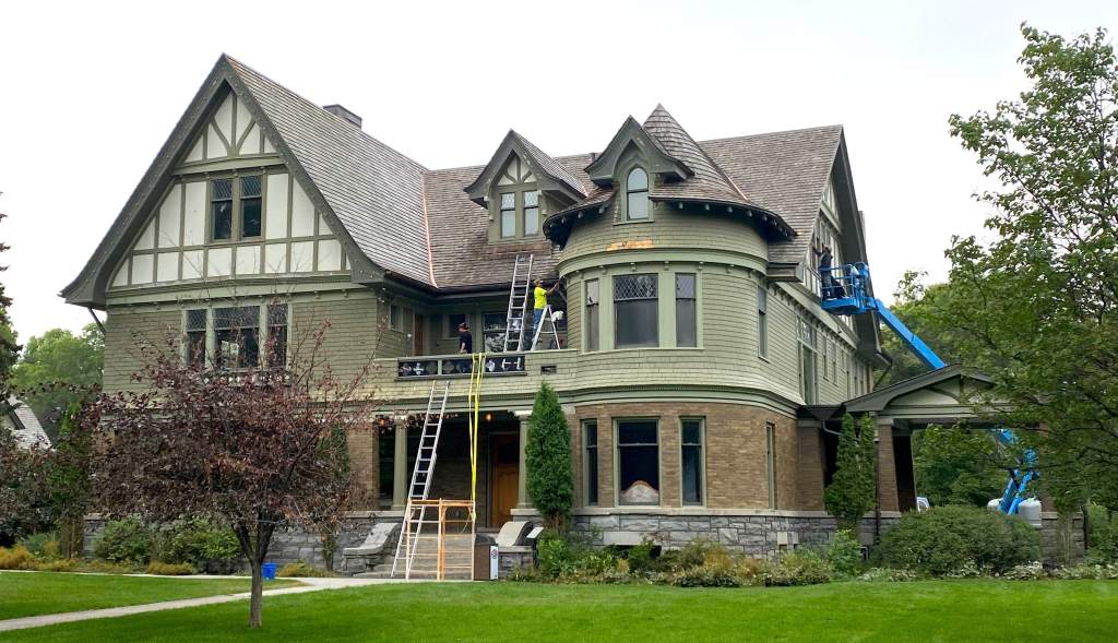 The great crew from Pace Painting has been working hard on the Mansion and it’s looking good! Here’s a few shots of the painters hard at work… Thanks guys for helping us restore this old building’s exterior to BEAUTIFUL!