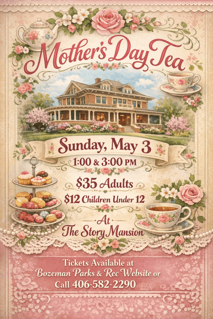 Experience the grandeur of the historic Story Mansion. Enjoy being served homemade cookies, pastries, and savory treats by the grand ladies of Bozeman, who will be dressed in period clothing. Break out your vintage attire and frolic back in time with us. Tea Times are by reservation only, and tickets can be purchased at Recreation | City Of Bozeman